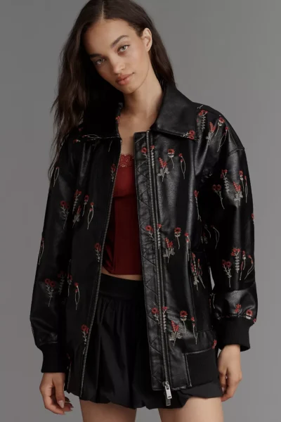 2. maeve faux leather floral embroidered bomber jacket